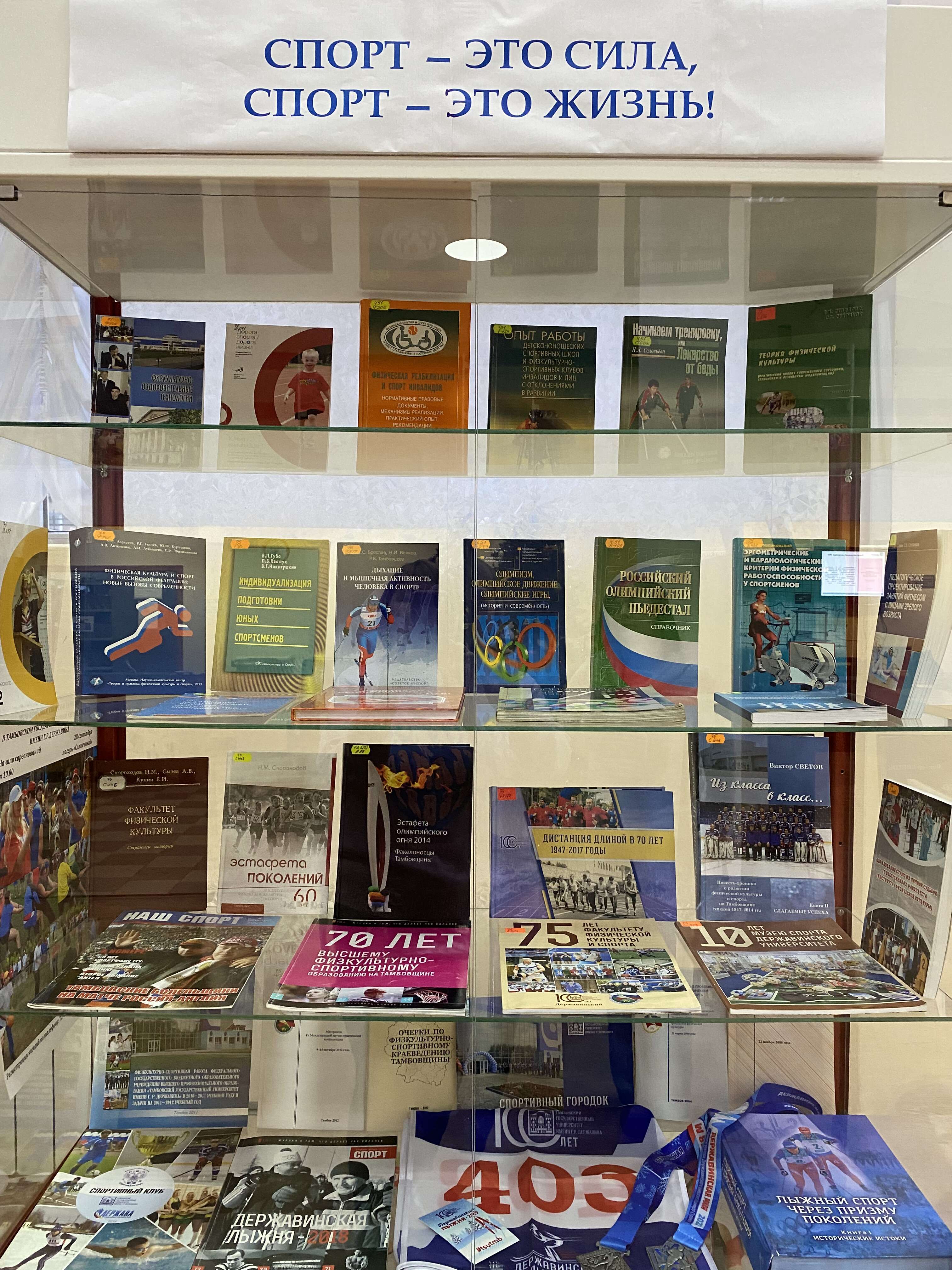 На выставке представлены книги о современных тенденциях физической культуры и спорта в Российской Федерации, физкультурно-оздоровительных технологиях, спортивной реабилитации лиц с ограниченными возможностями здоровья, а также книги, посвященные Олимпийскому движению и различным видам спорта.