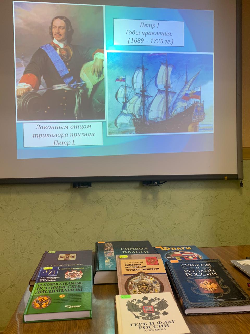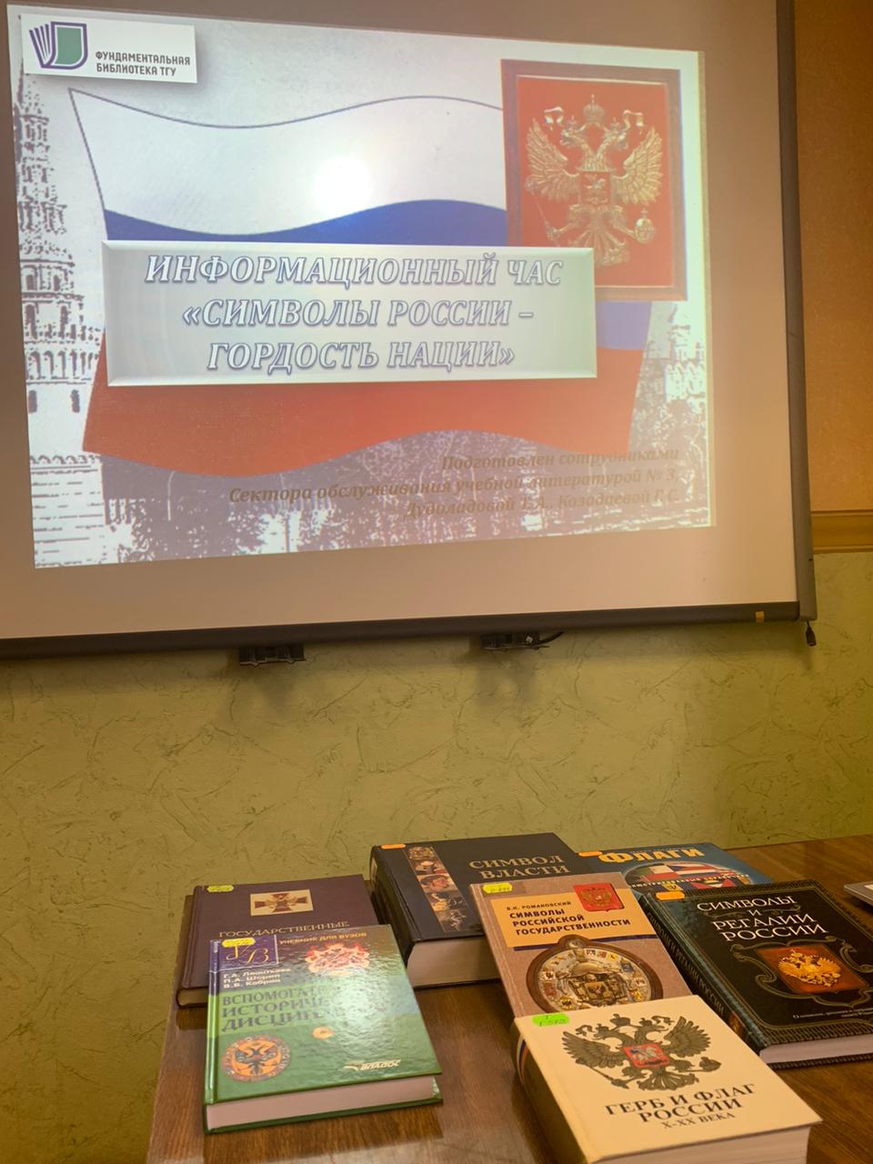 Для студентов третьего курса направления подготовки «Документоведение и архивоведение» в рамках патриотического воспитания и гражданского становления подрастающего поколения сотрудниками сектора обслуживания учебной литературой №3 Фундаментальной библиотеки был проведен информационный час «Символы России – гордость нации!»