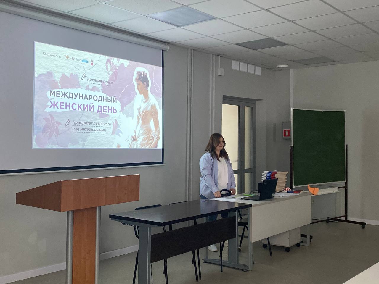 В преддверии первого весеннего праздника заведующая сектором обслуживания профильных классов Быкасова Мария Анатольевна провела с учениками 10-х классов беседу «Разговоры о важном», посвященную Международному женскому дню. Разговор шёл об истории возникновения праздника, о выдающихся женщинах, внесших свой вклад в историю России и отечественной науки. Не забыли известных литературных героинь – обсудили их образы и характеры. Ребята поучаствовали в игре, где нужно было определить женский персонаж по его описанию.