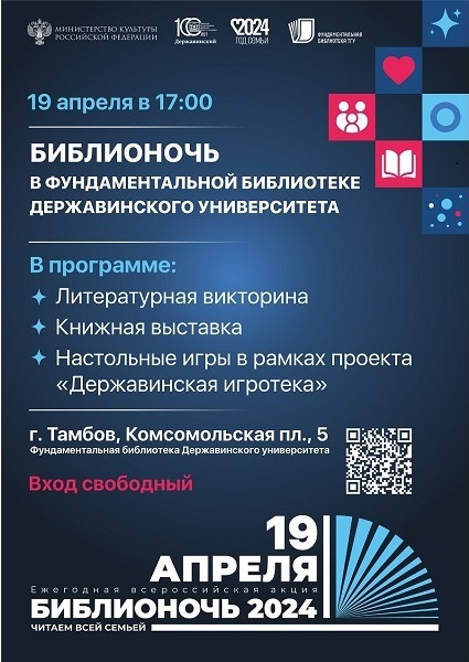 19 апреля 2024 г. Фундаментальная библиотека Державинского университета приглашает преподавателей и студентов на Библионочь - 2024 «Читаем всей семьей». Мероприятие состоится в 17-00 в читальном зале по адресу: г. Тамбов, ул. Комсомольская площадь, 5. Вас ждут:• литературная викторина • книжные выставки • семейные игры в рамках проекта «Державинская игротека»• призы и сувениры.