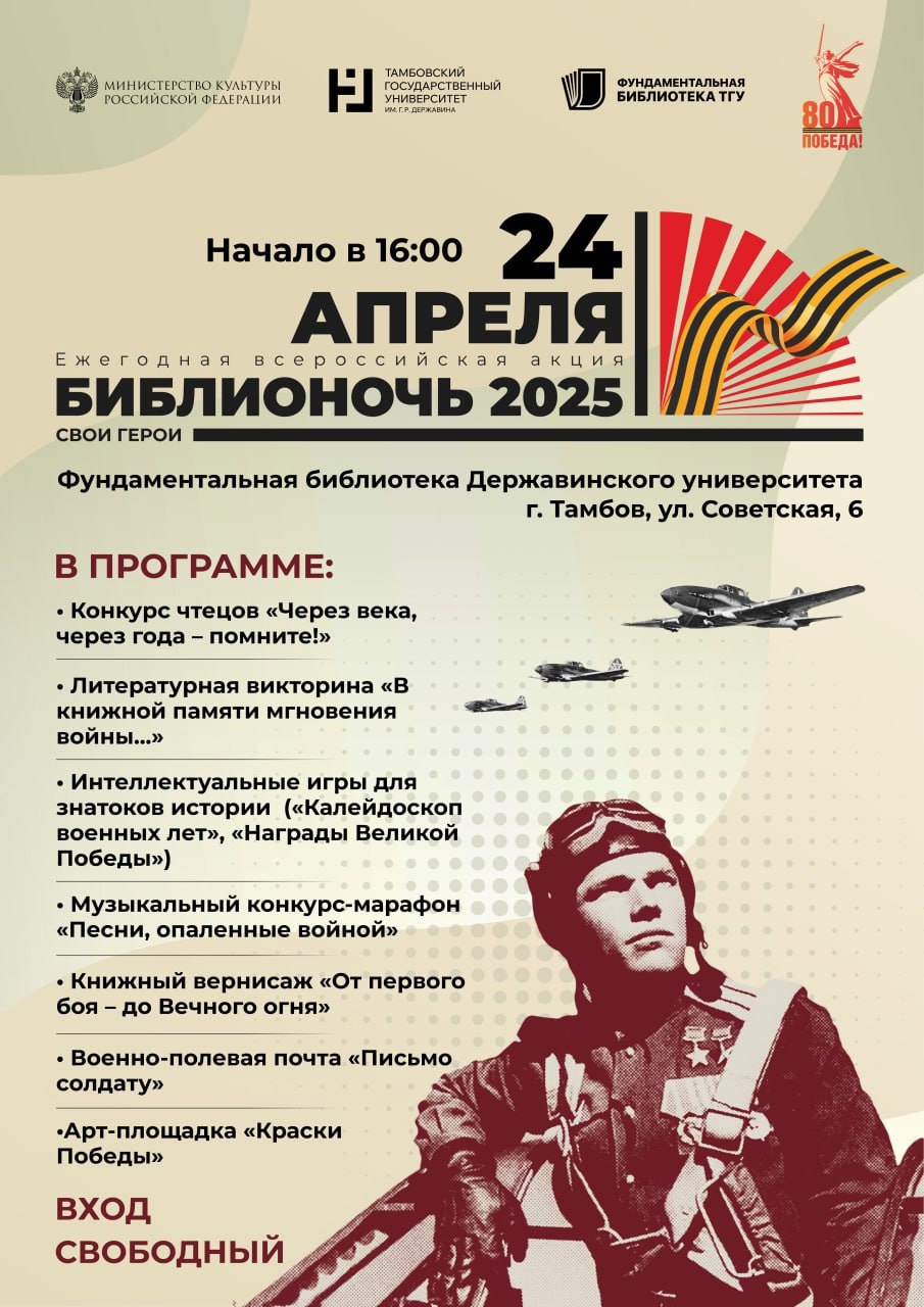 24 апреля 2025 г. Фундаментальная библиотека Державинского университета приглашает преподавателей и студентов на Библионочь – 2025 «Свои герои: к 80-летию Великой Победы и Году защитника Отечества».
