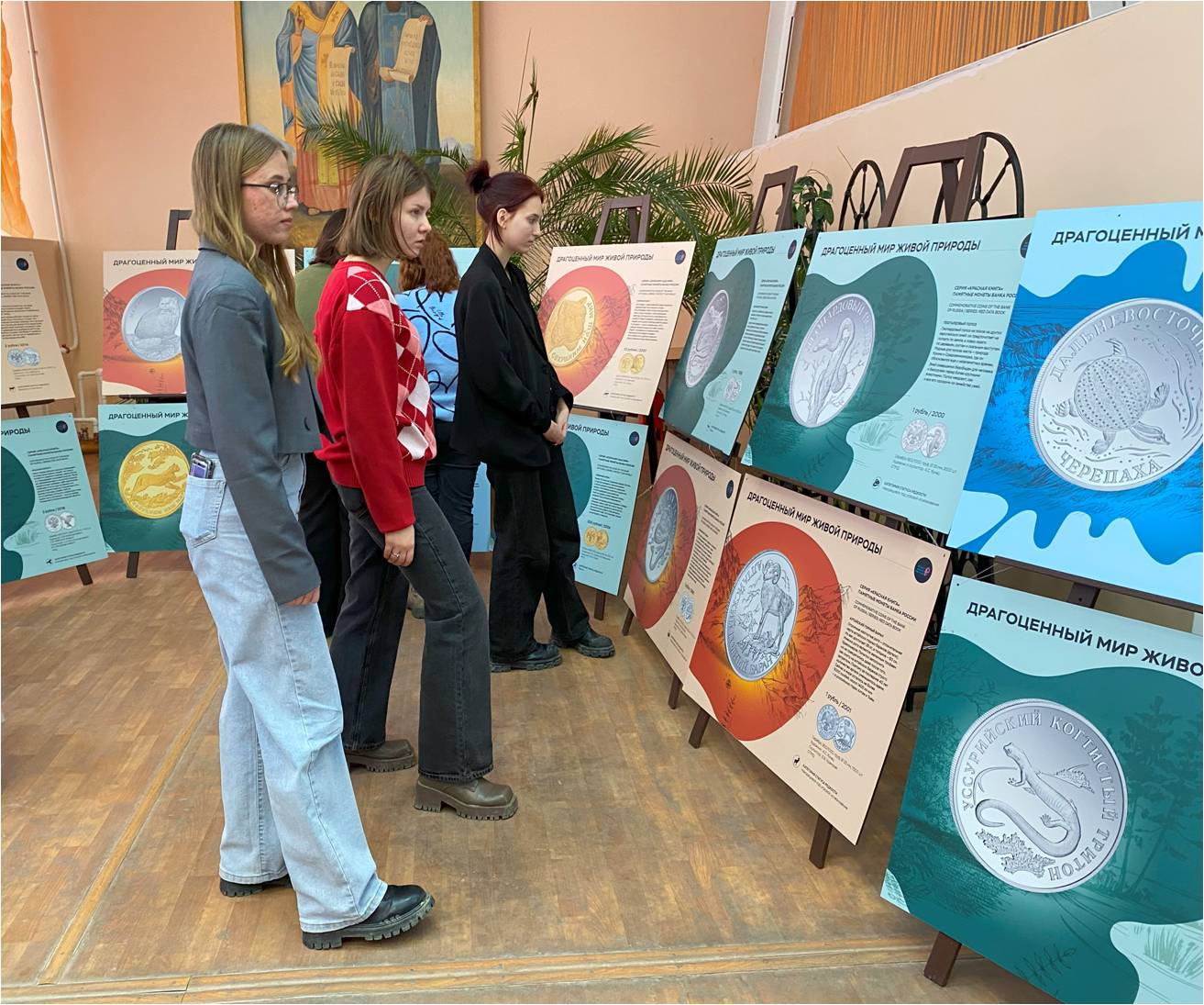 Студенты ознакомились с изображениями серебряных и золотых монет в увеличенном виде, на которых красуются редкие представители фауны из серии монет «Красная книга» и «Сохраним наш мир».