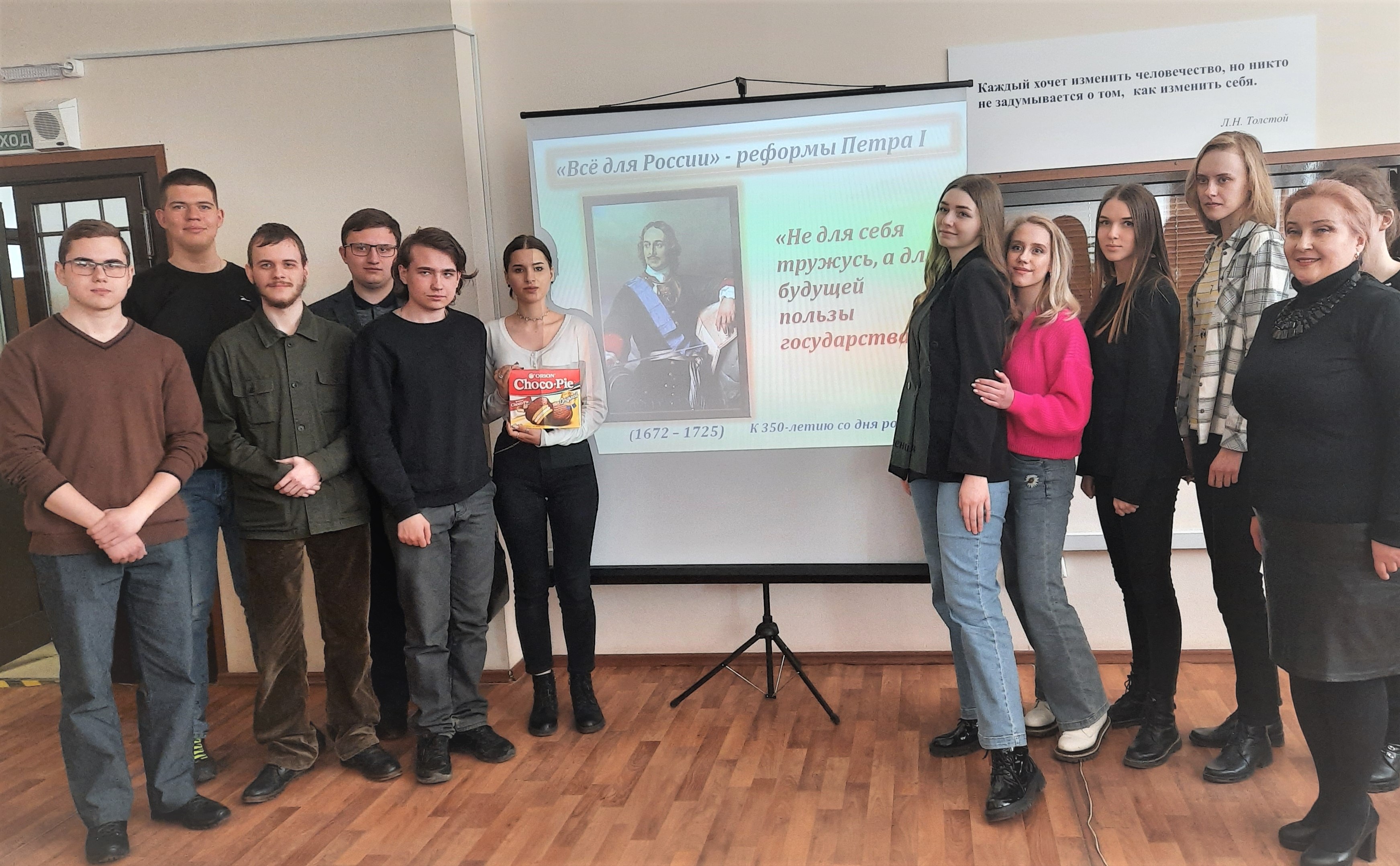 Ведущий библиотекарь сектора обслуживания учебной литературой № 2 Корявина Г.В. провела со студентами факультета истории, мировой политики и социологии познавательную викторину, на которой они проявили эрудицию и знание истории России - эпохи Петра Великого. Всем присутствующим был продемонстрирован документальный фильм о жизни и реформах Петра I, а также вниманию участников была представлена выставка книг «Петр Великий – первый Император Всероссийский».