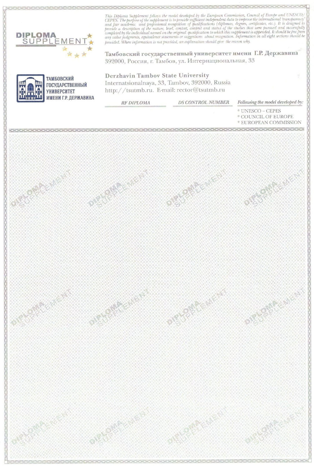 Европейское приложение к диплому содержит информацию на английском языке о владельце диплома, полученной им квалификации, уровне этой квалификации, содержании программы обучения и его результатах, выраженных в кредитах системы ECTS (Европейская система зачёта трудоёмкости), о функциональном назначении квалификации, а также информацию о национальной системе образования в Российской Федерации.