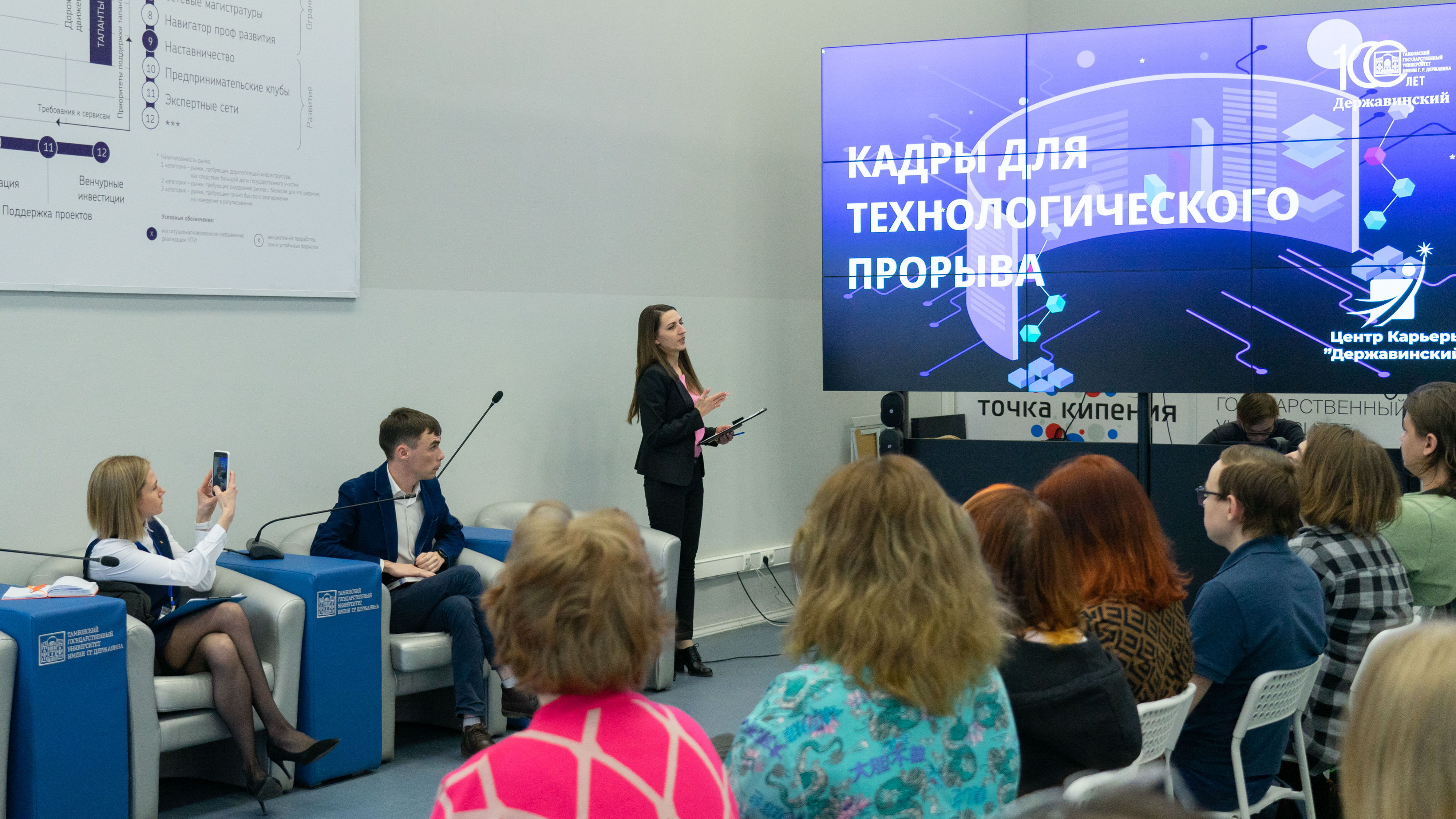 В Технопарке «Державинский» прошла встреча с представителями крупнейших промышленных предприятий региона «Кадры для технологического прорыва». Спикеры – руководитель группы подбора и адаптации персонала АО «Пигмент» Ирина Панкова, начальник отдела информационных технологии АО «Корпорация «Росхимзащита» Денис Ситников и специалист по работе с молодежью ПАО «Тамбовский завод «Электроприбор» Оксана Щаникова. Они рассказали державинцам о карьерных возможностях для молодых специалистов.
